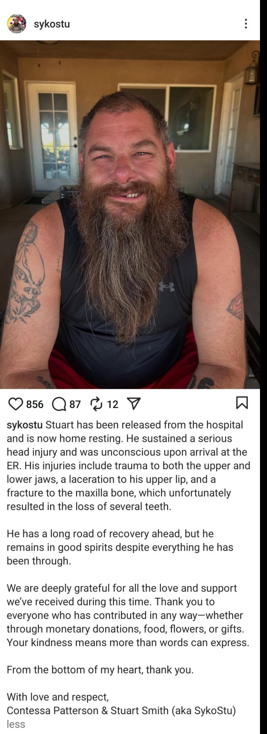 This is an encouraging Syko Stu update–but how has there not been an arrest from his attack?